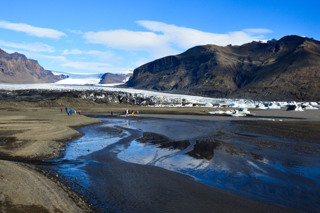 W Centrum dla Zwiedzających można się ogrzać, zjeść coś i dowiedzieć się więcej o rezerwacie, jak i całym Parku Narodowym Vatnajökull, którego jest częścią. My „złapaliśmy” skry, których fanami się staliśmy i wyruszyliśmy w przeciwną stronę do wodospadów. Prawie 1-kilometrowy szlak doprowadził nas pod czoło jednego z największych lodowców w Europie: Vatnajökull. Zaczął on się formować ponad 4000 lat temu i zajmuje około 7800 km², czyli 8% powierzchni wyspy. Pod jego powierzchnią znajduje się kilka aktywnych wulkanów oraz źródła wielu rzek. Lodowiec kojarzył mi się dotychczas głównie z zimnem i białym kolorem, ale okazało się, że może się „pobrudzić” — część jego powierzchni pokrywa czarna warstwa pyłu pochodzącego z erupcji sprzed wielu lat, a może nawet wieków.