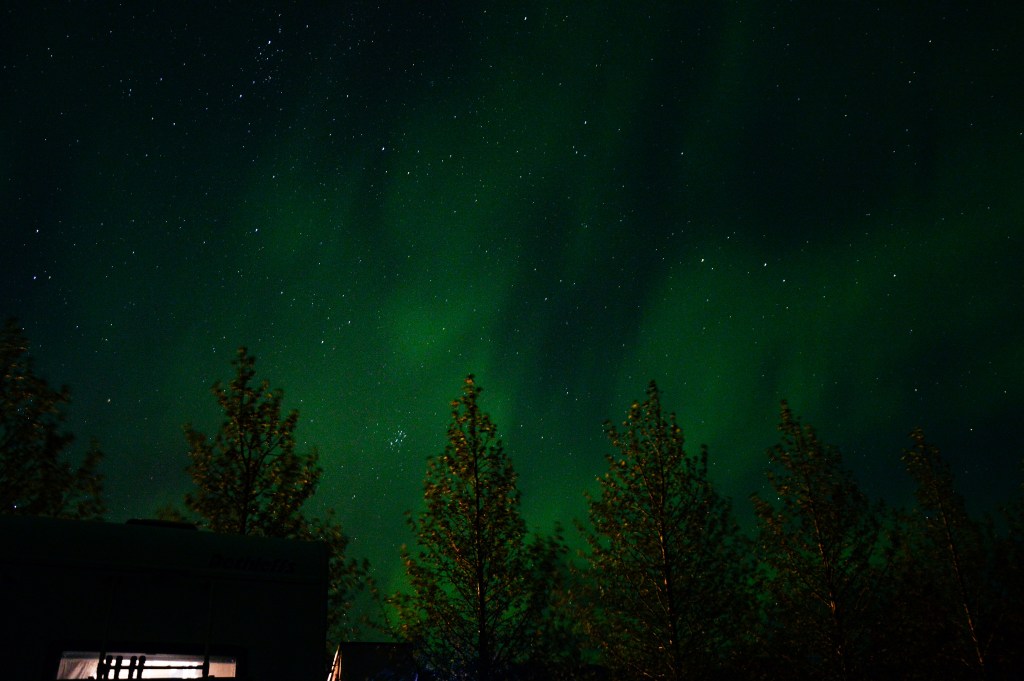 Tym razem podróż minęła nam bez dodatkowych atrakcji, chyba że za takie uznać szybką wizytę w sklepie i tankowanie. Dotarliśmy do hostelu prowadzonego przez Polaków, gdy było już ciemno, ale jeszcze nie późno. Pod koniec września słońce na Islandii zachodzi przed 20. W końcu mieliśmy czas na spokojne przygotowanie i zjedzenie kolacji. A ja zrobiłam kilka zdjęć zorzy. W końcu mi wyszły! Aureola nie była tak wyraźna jak pierwszego dnia, ale i tak pięknie „tańczyła” na gwiaździstym niebie. Zimno, zmęczenie oraz możliwość podziwiania tego zjawiska poprzedniej nocy sprawiły, że wybraliśmy odpoczynek zamiast dalszego wpatrywania się w niebo.