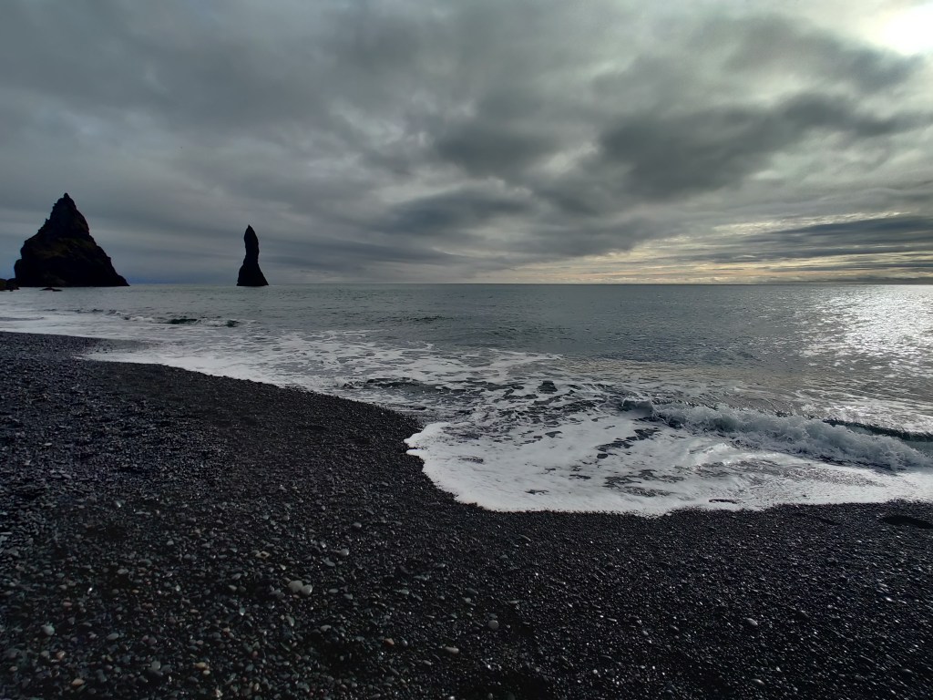 Niedaleko Vík í Mýrdal zatrzymaliśmy się na słynnej czarnej plaży Reynisfjara. To miejsce zachwyca swoją surową urodą — bazaltowe kolumny, jaskinia Hálsanefshellir i samotne skały Reynisdrangar wyłaniające się z Atlantyku tworzą niesamowity krajobraz. Jednak plaża jest równie piękna, co niebezpieczna. Fale oceanu bywają tu nieprzewidywalne i potężne, mogą zaskoczyć swoją siłą. Dodatkowym zagrożeniem są odłamujące się fragmenty klifów. Przy wejściu na plażę zamontowano system ostrzegawczy, który dzieli plażę na strefy zagrożenia i wskazuje aktualne niebezpieczeństwo — warto zwrócić na to uwagę i przestrzegać zasad.