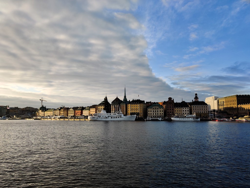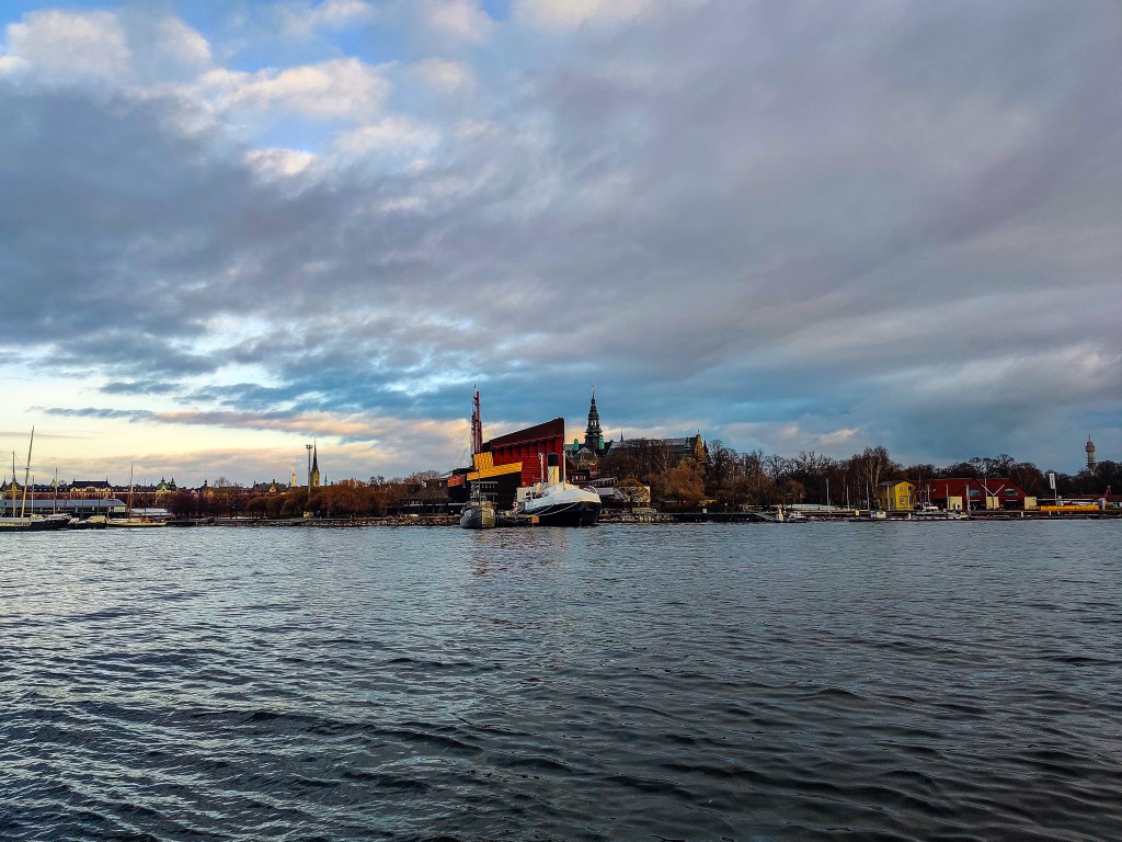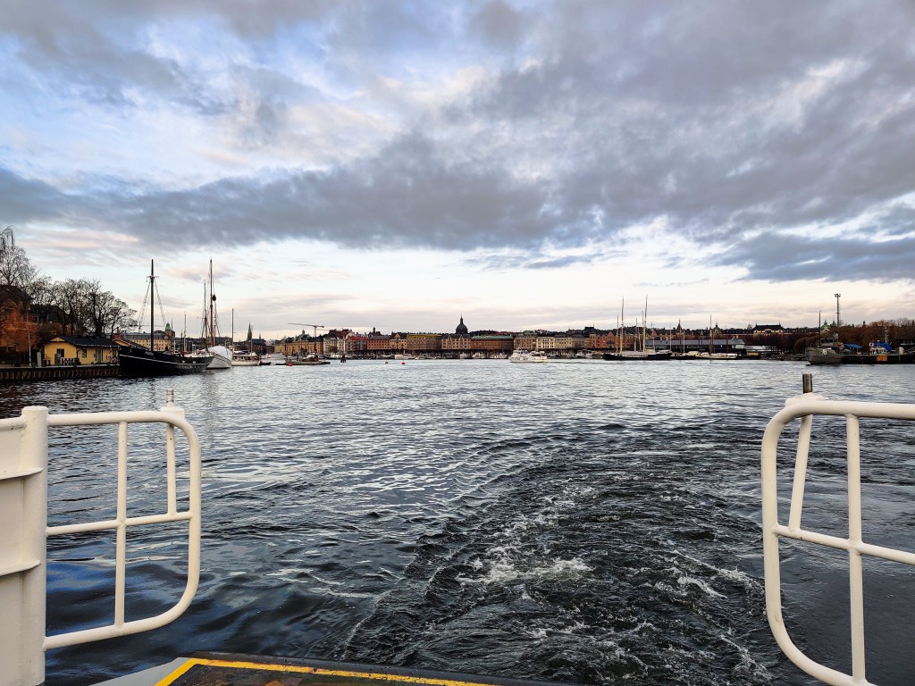 Spacerując po mieście, podziwialiśmy panoramę Starówki. Naszym celem był Skansen, jednak zboczyliśmy z trasy i przypadkowo dotarliśmy do przystani promowej. Ten środek transportu jest częścią sztokholmskiej komunikacji miejskiej – obowiązują na nim te same zasady co w autobusach czy tramwajach. Zdecydowaliśmy się skorzystać z okazji na nietypowy transport. Jednak prom nie płynął bezpośrednio na Djurgården – docelową wyspę, gdzie znajduje się Skansen. Zatrzymaliśmy się najpierw na Stadsholmen, jednej z wysp tworzących Stare Miasto, a następnie dopłynęliśmy do przystani przy Gröna Lund – parku rozrywki w stylu wesołego miasteczka, niestety tymczasowo zamkniętego.