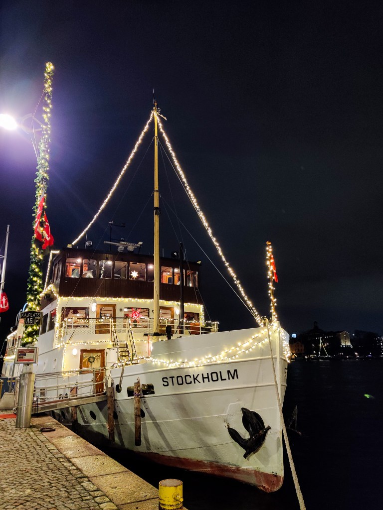 Jesienno-zimowe dni w Szwecji są jeszcze krótsze niż w Polsce. Wychodząc z Muzeum Vasa, zastaliśmy już zapadający zmrok, ale Sztokholm rozświetliły tysiące świateł. Ulice, promenady, parki i statki zacumowane przy brzegu były ozdobione świątecznymi dekoracjami, które nadawały miastu magiczny klimat. Z każdego zakątka emanowała atmosfera zbliżających się świąt.