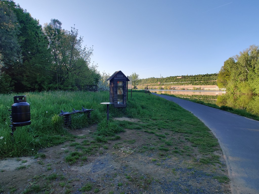 Po drodze trafiliśmy też na wyjątkowy przystanek – ławkę zrobioną ze starych łopat, kosz na śmieci z butli gazowej, a w zamkniętej gablocie z drewna… darmowa biblioteczka dla podróżnych. Była nawet lina do huśtania zawieszona na gałęzi nad rzeką – świetna atrakcja dla spragnionych odrobiny adrenaliny.