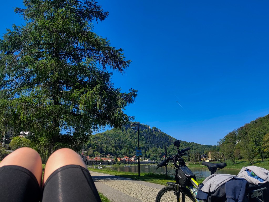 Początkowo planowałam dotrzeć tego dnia do granicy, ale po naszej stronie rzeki brakowało odpowiednich miejsc noclegowych w rozsądnej odległości. Dodatkowo, konieczna była kolejna wymiana dętki. Ostatecznie zatrzymaliśmy się w miejscowości Děčín, ponownie w pobliżu torów kolejowych. Oprócz Łaby, to właśnie kolej towarzyszyła nam przez większość trasy 😊
