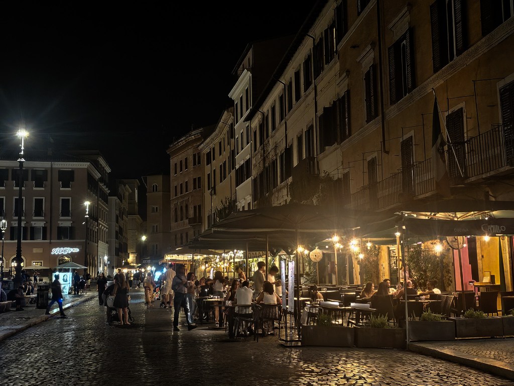 Wieczorem warto zajrzeć na Campo de’ Fiori. Rano działa tu tętniący życiem targ, a wieczorem plac zamienia się w miejsce spotkań – pełne muzyki, gwaru i ludzi siedzących przy stolikach na zewnątrz. W centrum stoi pomnik Giordano Bruno, spalonego tu w XVII wieku za poglądy uznane przez Kościół za heretyckie.