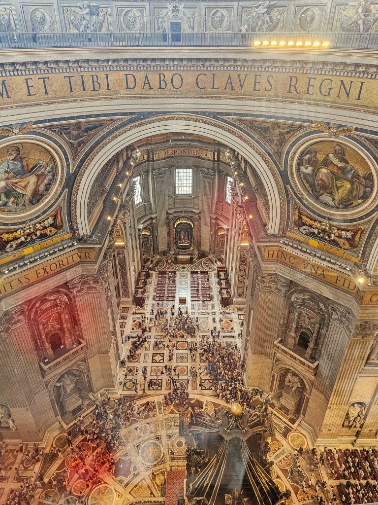 Kolejnym punktem jest kopuła Bazyliki św. Piotra – wyjątkowy punkt widokowy na Rzym i Watykan. Aby się tam dostać, trzeba pokonać 551 schodów. Nie polecam dopłacania do biletu „z windą”, jeśli nie musisz – podjeżdża ona tylko mniej więcej do połowy (łatwiejszej) wysokości, a pozostałe 320 schodów i tak trzeba pokonać pieszo. W niektórych miejscach schody są wąskie, a dach kopuły w niektórych momentach „kładzie się” na nas, ale widok z góry wynagradza ten wysiłek.