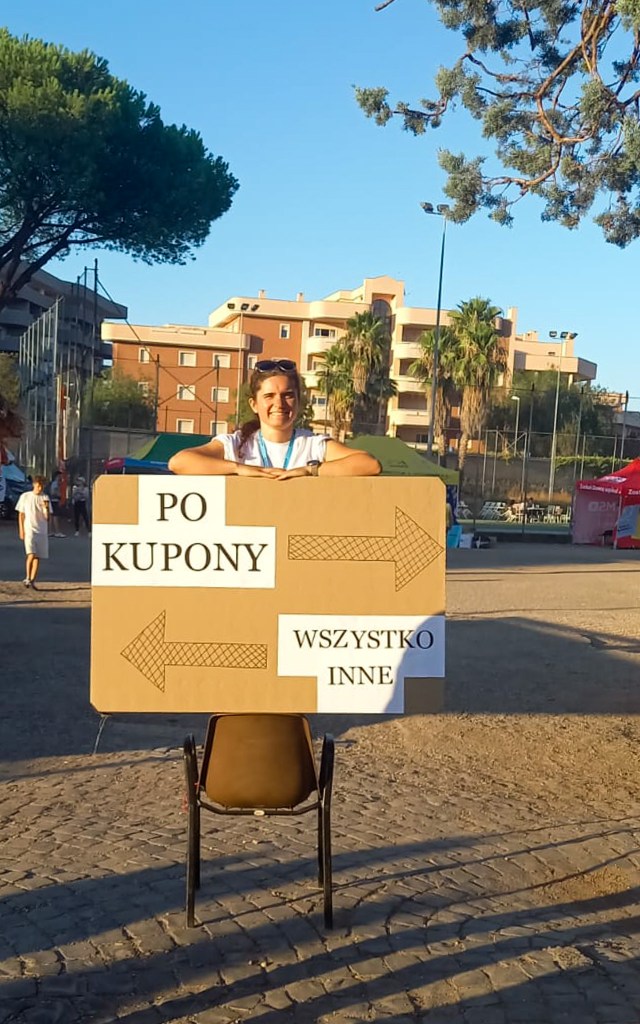 i uratowanie mojego głosu podczas „kierowania ruchem” na placu przy Casa Polonia. Przy kilku tysiącach osób to naprawdę było wyzwanie, szczególnie w porze posiłku. Dzięki tablicy łatwiej było uniknąć zatorów – ci, którzy chcieli odebrać kupony na jedzenie, powinni iść w lewo, a po wszystkie inne sprawy (toalety, punkty informacji czy sam odbiór posiłku) kierować się w prawo. Proste, prawda? 😄