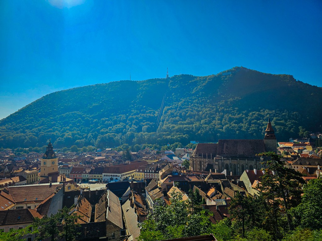 Aby zobaczyć miasto „z góry”, warto wejść na mury miejskie lub któryś z bastionów będących częścią systemu obronnego. Mimo zmęczenia po wędrówce z dnia poprzedniego nie mogłam sobie odmówić wejścia na Bastion Tkaczy — to był mój mały dystansowy „test” (tak, nawet jednego dnia nie potrafię odpuścić, jeśli warto). Spod bastionu rozciąga się piękna panorama na całe Brașov. Po drugiej stronie miasta widoczny jest wielki napis Brașov, nazywany rumuńskim „Hollywood”. Podobno stoi on w miejscu, w którym podczas najazdu na miasto Wład Palownik (Drakula) kazał nabić na pal handlarzy, sprzeciwiających się jego rozkazom.