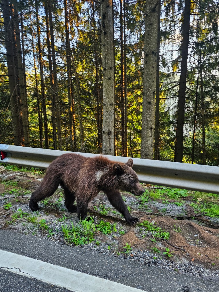 Transfăgărășan jest bardzo popularna – w środku dnia czy rano ruch bywa spory. My jechaliśmy późnym popołudniem, dzięki czemu nie było tłumów, a do tego zwiększyliśmy swoje szanse na spotkanie… niedźwiedzi. I udało się! Wyczekiwane przez cały wyjazd pojawiły się tuż przy drodze, jak gdyby nigdy nic spacerując poboczem.