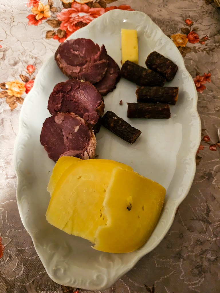 Po drodze zatrzymaliśmy się jeszcze przy jednym z nielicznych stoisk, by spróbować lokalnych specjałów: kiełbasy z niedźwiedzia (smak dość specyficzny, mocno „doprawiony” – nie dla każdego), delikatniejszej kiełbasy z owcy i serów – krowich i owczych. Trudno porównać je do czegoś bardziej znanego, więc najlepiej spróbować samemu.
